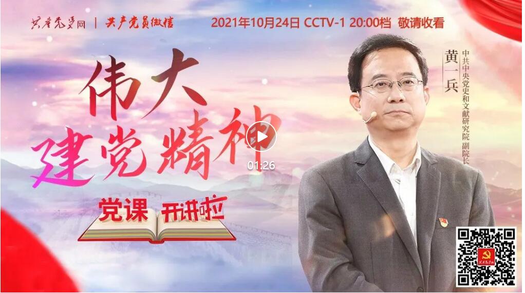 由中共中央组织部、中央广播电视总台联合录制的《党课开讲啦》节目第2期《伟大建党精神》(黄一兵主讲)定于10月24日(星期日)晚间8点档在中央电视台综合频道(CCTV-1)播出,敬请收看。