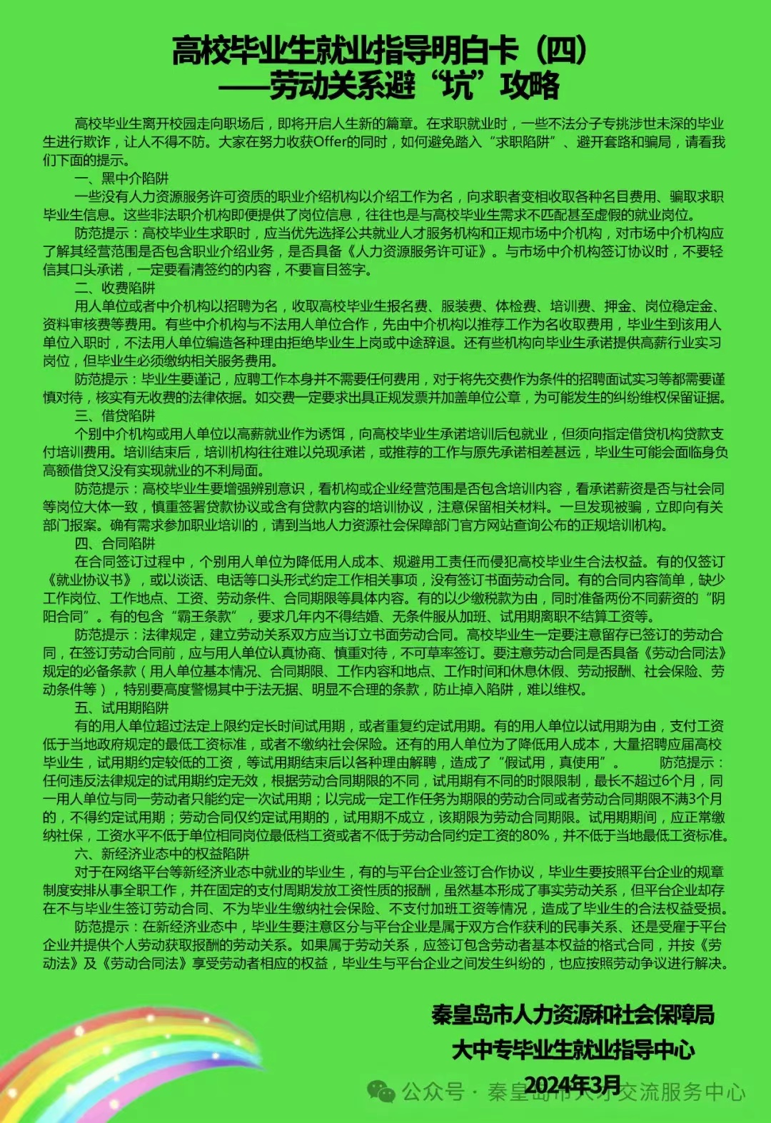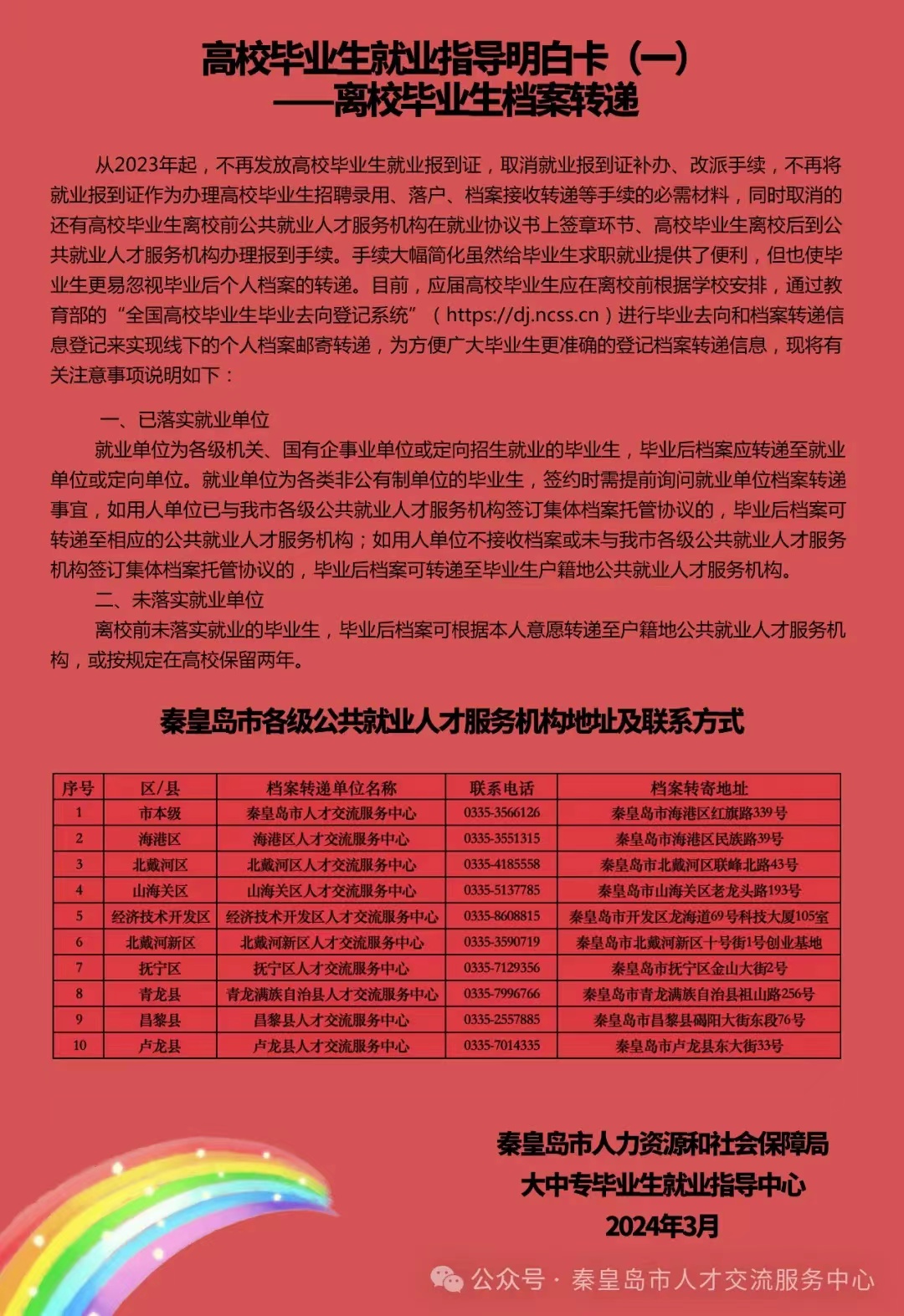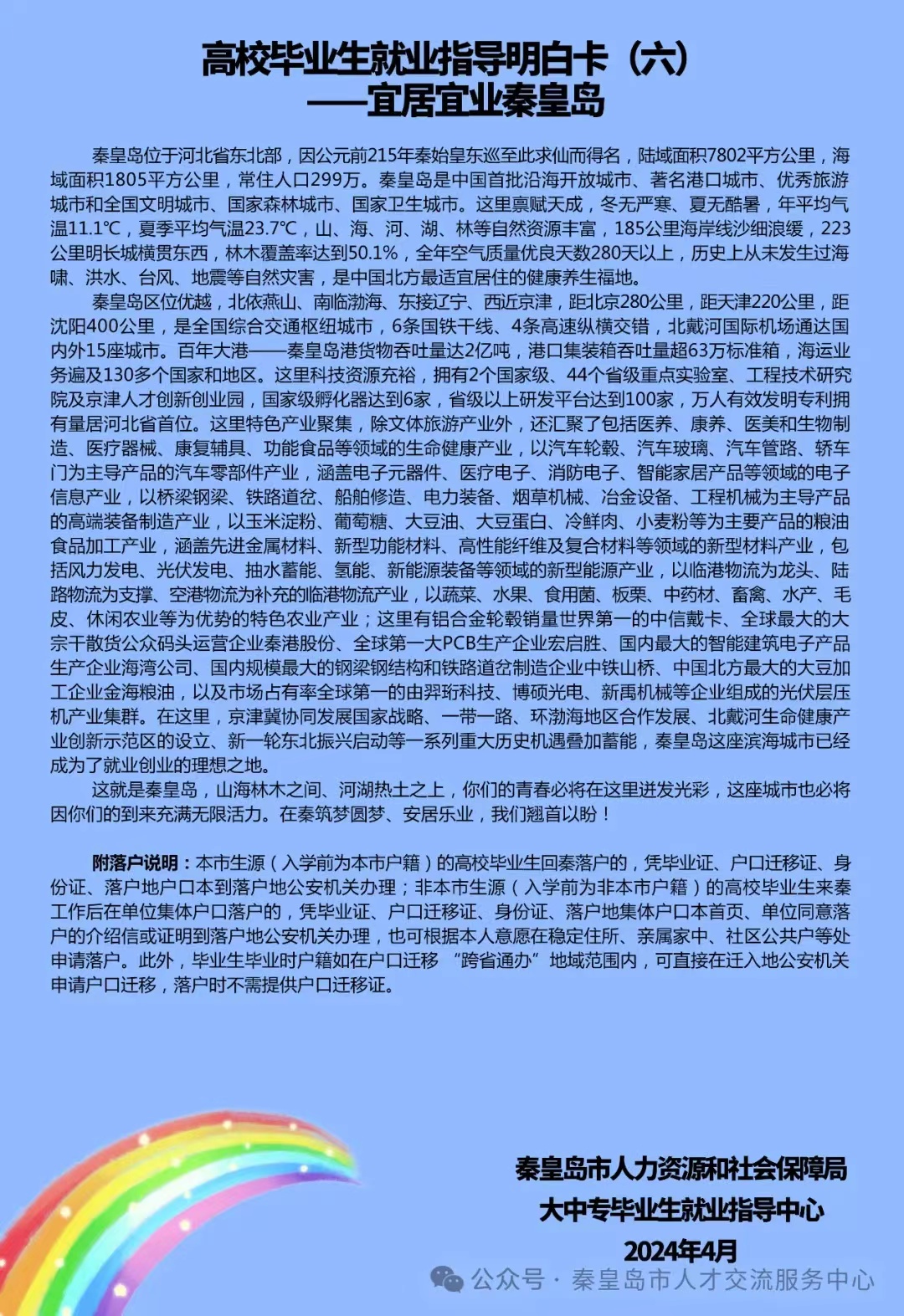 秦皇岛市人社局毕业生就业指导中心更新发布第二期共6版高校毕业生就业指导明白卡,希望用这道就业指导彩虹为更多的毕业生指引前行的方向。