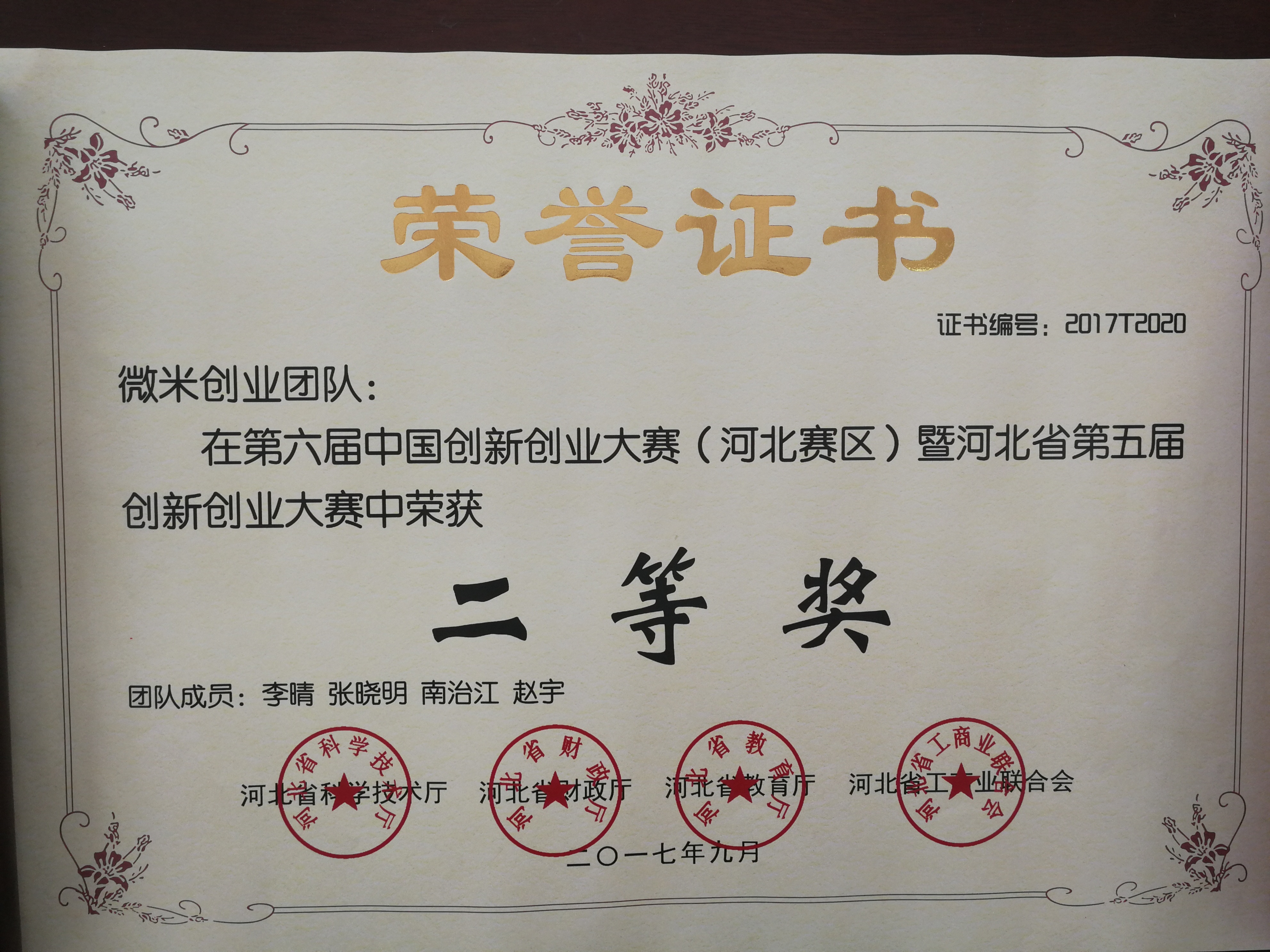 近日,在第六届中国创新创业大赛(河北赛区)暨河北省第五届创新创业大赛中,永利yl23411吴玉静老师指导的创业团队“微米科技有限公司”荣获二等奖,参赛员工为14级法学李晴、张晓明、南治江、赵宇。