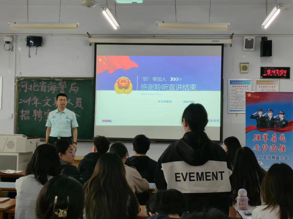 会议由河北省海警局干事进行主讲,公司张永丰书记,刘艾嘉老师到场指导。会议伊始,河北省海警局宣讲员首先介绍了海警的职责和工作内容、文职人员的主要情况,并与同学们一起观看了中国海警文职人员公开招聘宣讲片。其次,河北省海警局宣讲员围绕文职人员的三种分类——管理类、专业技术类、专业技能类阐述其定位、从事工作、政策制度、退出机制以及同学们关心的工资薪酬,住房保障,福利待遇等问题。河北省海警局宣讲员专业幽默的宣讲深深吸引了同学们的兴趣,均积极踊跃提问问题。