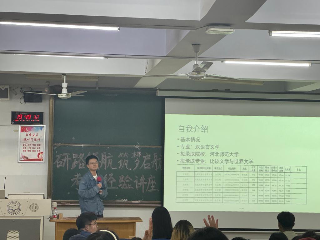 在本次考研经验分享讲座中,永利yl23411为此次讲座做了充足的准备,工作人员为此次讲座做了全面的后勤保障工作,确保讲座的顺利进行。来自汉语国际教育、汉语言文学、社会工作、法学以及知识产权专业的学长学姐将自己的考研经验耐心的传授给同学们,讲述了考研流程、考研准备时间以及自己在考研过程中的心路历程、遇到的挑战、以及最终得到的经验;还为同学们提供了可以参考的网课以及资料。过程流畅自然,充满了关于考研的经验性知识。参与本次讲座的同学们认真聆听,不错过每一条考研经验,并积极与学长学姐进行了有效的互动,现场气氛一片活跃。伴随着最后一位知识产权学长的生动讲述,本次讲座取得圆满成功。让同学们对自身考研有了更为清晰的认知,获得了许多有用的考研经验,为日后考研打下基础。