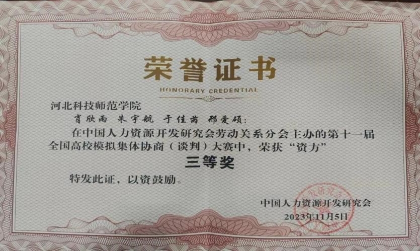 经过两天的激烈角逐,公司员工表现优异,资方代表队荣获大赛三等奖,劳方代表队荣获大赛二等奖,成玥霖、邢爱硕两位同学荣获最佳谈判员一等奖,王晓燕、刘秀清、辛宇鹤三位老师荣获优秀指导老师一等奖。
