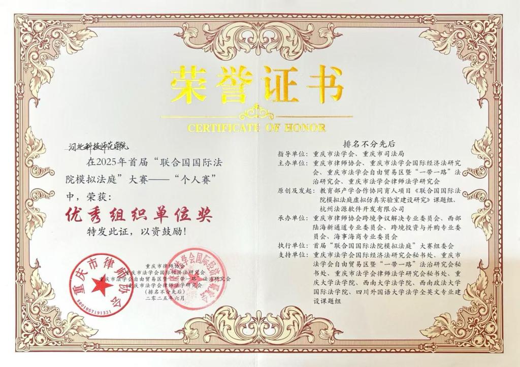 近日,在2025年首届“联合国国际法院模拟法庭”大赛——“个人赛”中,河北科技师范公司凭借出色的组织工作和师生的优异表现,荣获“优秀组织单位奖”,永利yl23411赵福江、郝世坤等老师获优秀指导教师奖。该奖项由重庆市律师协会、重庆市法学会等多家权威机构联合颁发。